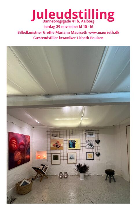 Jeg er billedkunstner, og holder juleudstilling i mit studio i Aalborg vestby, Åbner 23.11 kl 13.00 -19.00, og åbent de følgende fire uger torsdag og fredag. Velkommen!